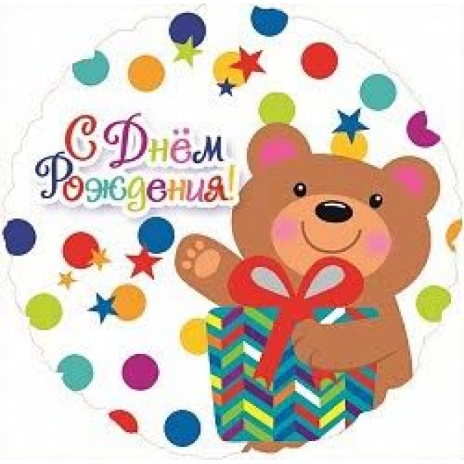 - Фольгированный шар круглый "С Днем рождения" (46 см) с рисуноком мишки с подарком и конфетти