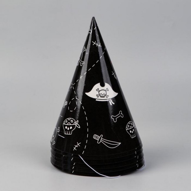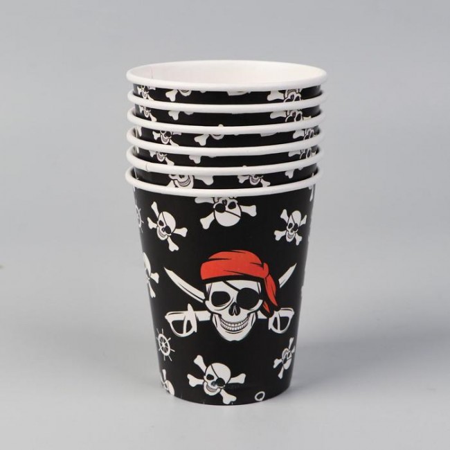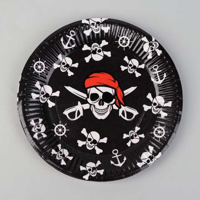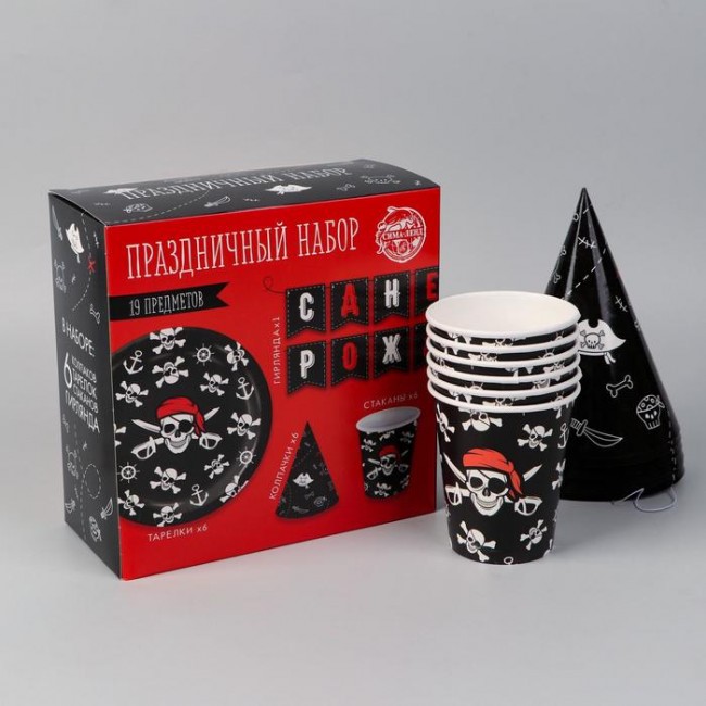 - Набор бумажной посуды «Пиратский», 6 тарелок, 6 стаканов, 6 колпаков, 1 гирлянда