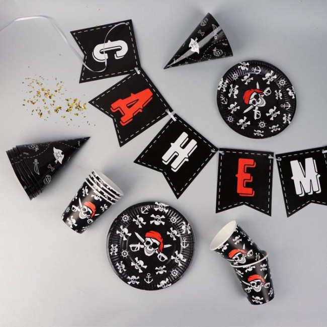 Набор бумажной посуды «Пиратский», 6 тарелок, 6 стаканов, 6 колпаков, 1 гирлянда