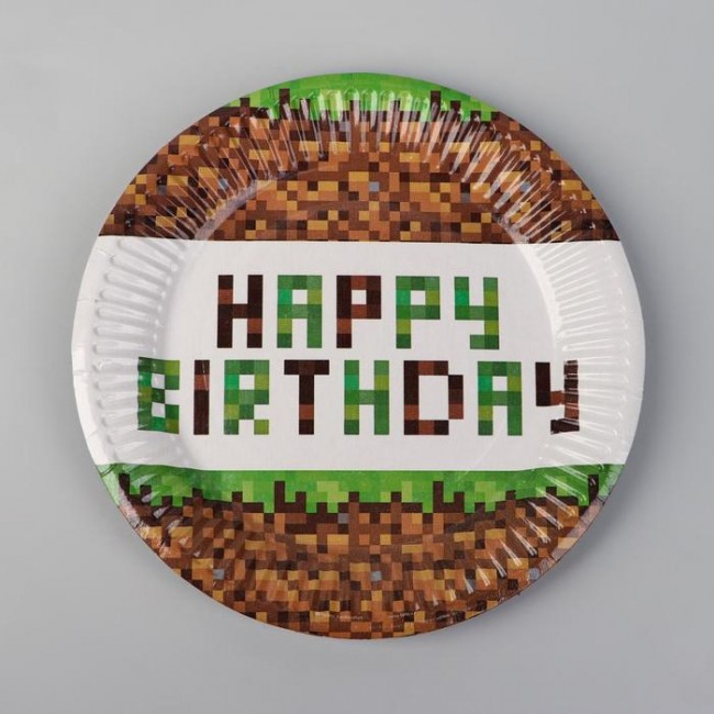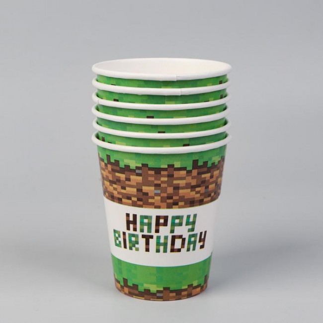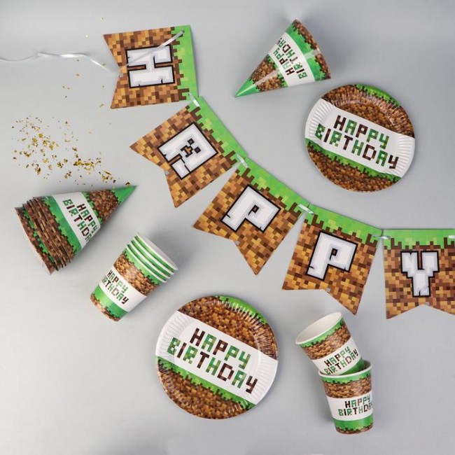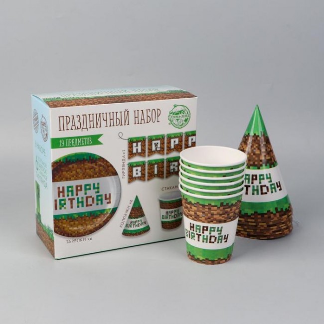 - Набор бумажной посуды «С Днём рождения», 6 тарелок, 6 стаканов, 6 колпаков, 1 гирлянда