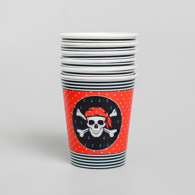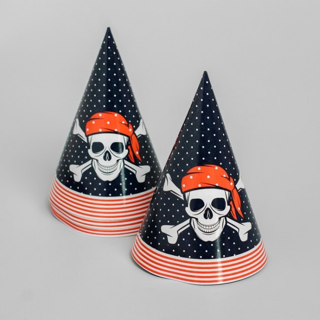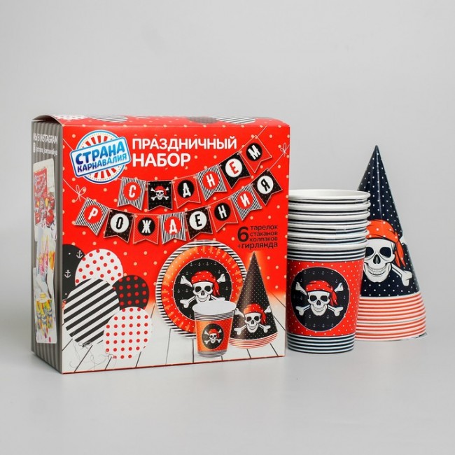 - Набор бумажной посуды «С днём рождения», пиратский: 6 тарелок, 6 стаканов, 6 колпаков, 1 гирлянда