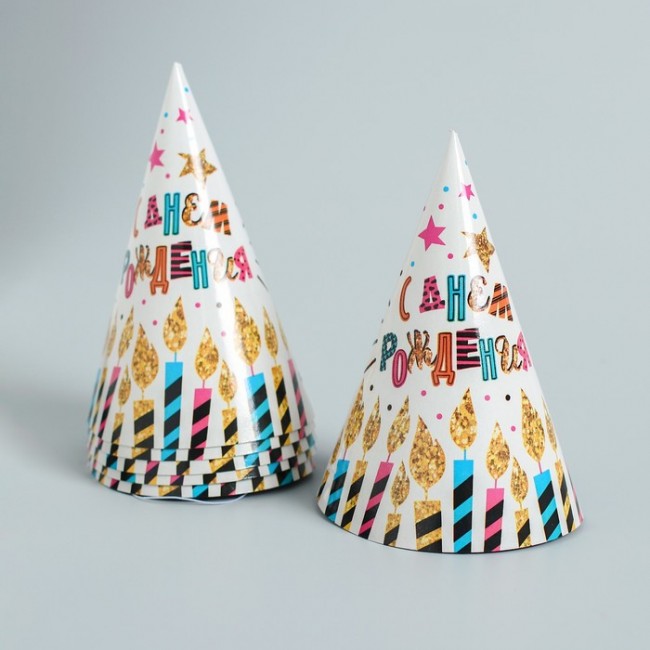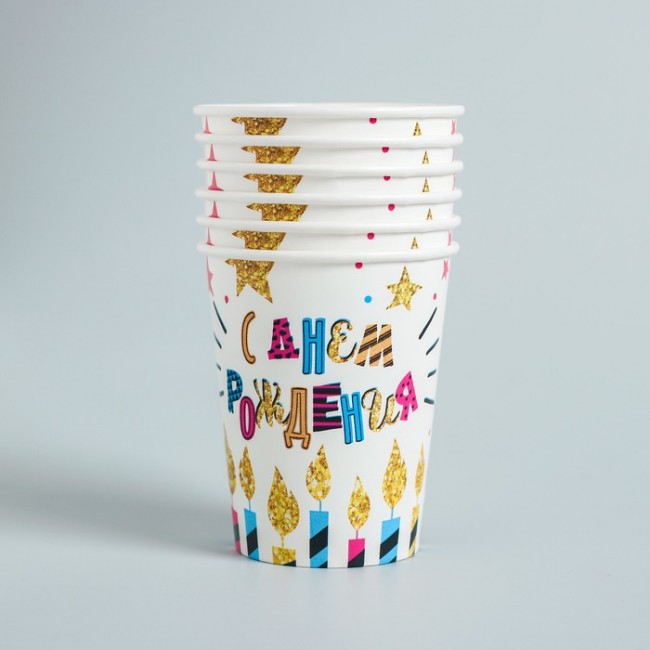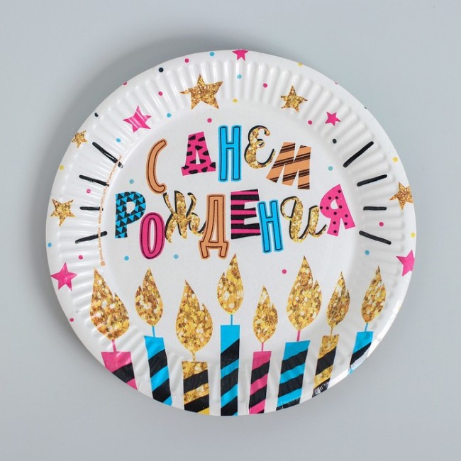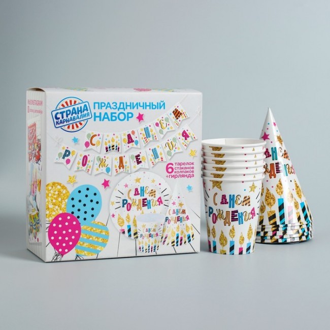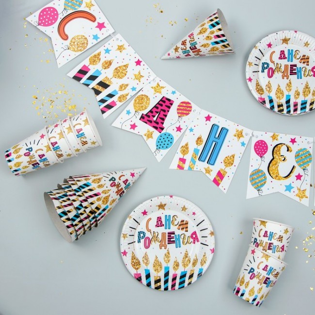 - Набор бумажной посуды «С днём рождения. Праздничные свечи»: 6 тарелок, 6 стаканов, 6 колпаков, 1 гирлянда