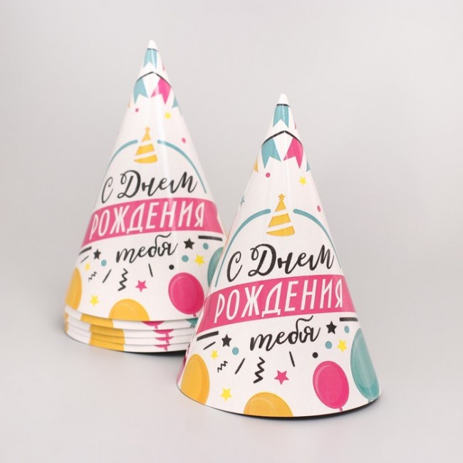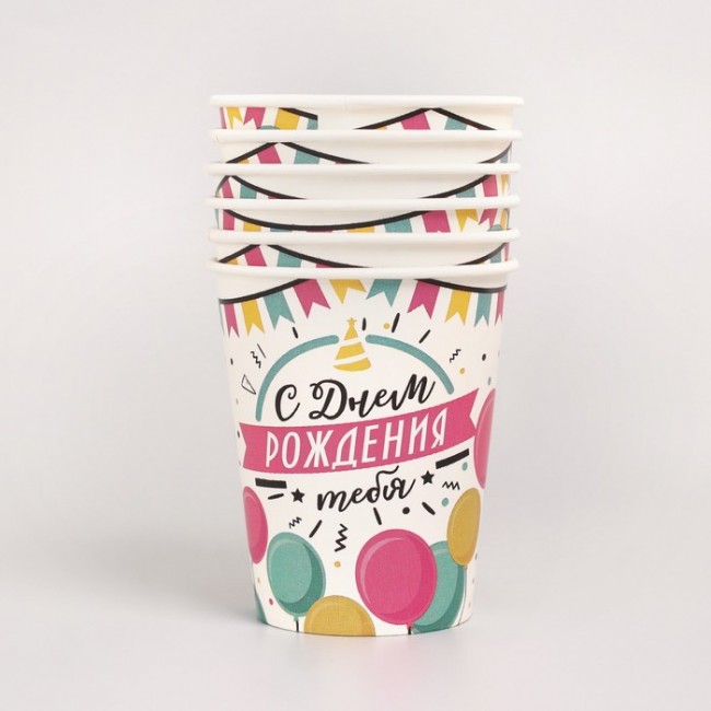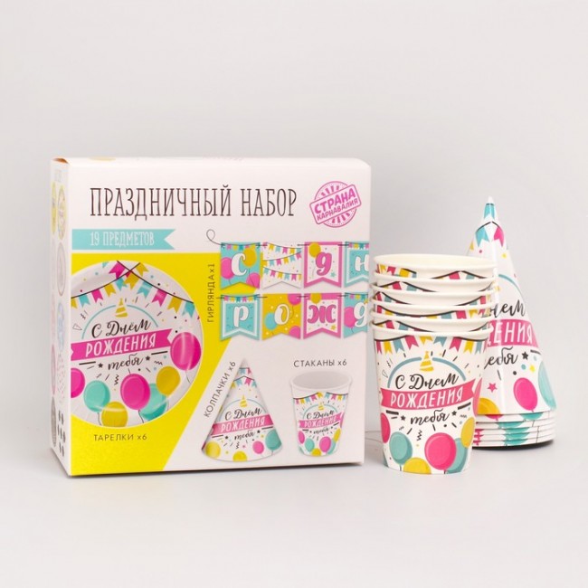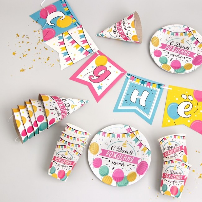 - Набор бумажной посуды «С днём рождения. Шары с гирляндой»: 6 тарелок, 1 гирлянда, 6 стаканов, 6 колпаков