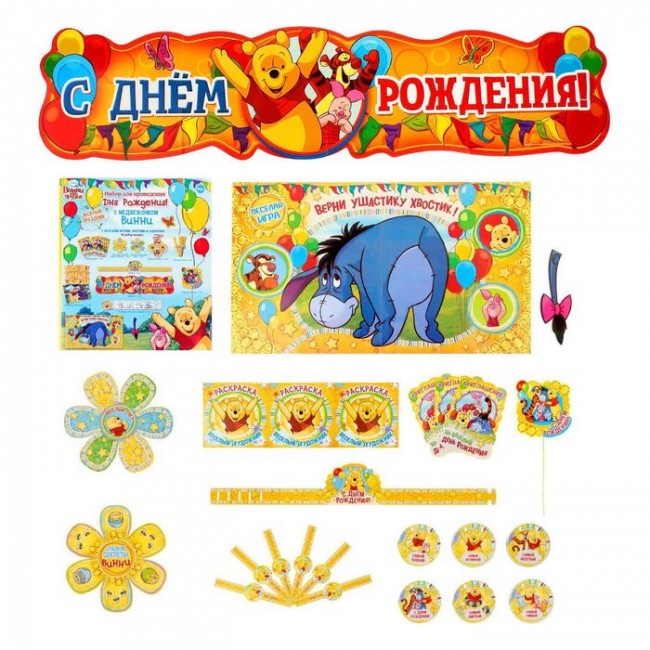 День рождения — праздник, который с нетерпением ждут все дети, ведь он означает подарки, вкусные угощения и весёлые игры с друзьями. Оформить торжество поможет набор с любимым медвежонком Винни и его друзьями! В нём уже есть всё необходимое для дружной детской компании.