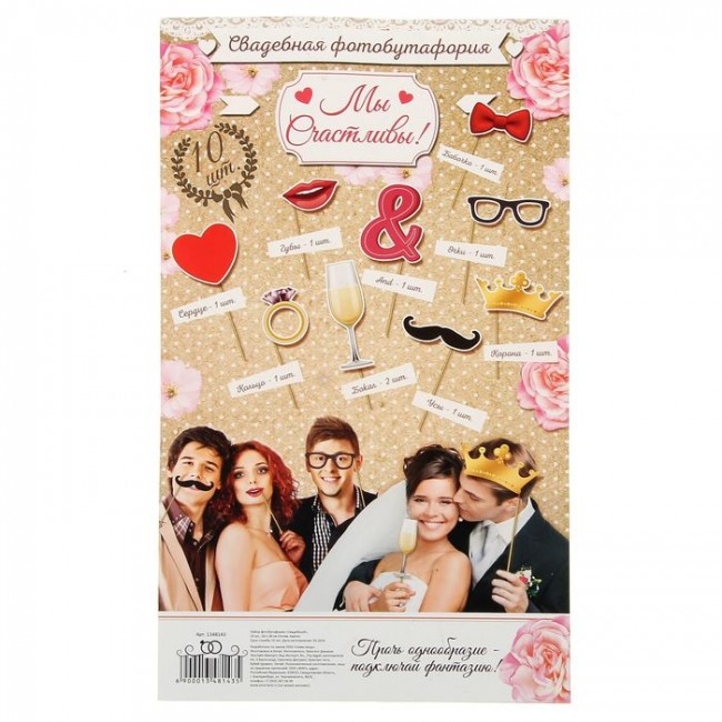 Набор состоящий из 10 предметов — прекрасный выбор для создания атмосферы праздника и удивительных свадебных снимков, которые останутся на память и будут вызывать тёплые воспоминания об этом дне. Товар отличается не только оригинальным дизайном и высоким качеством, но и имеет яркую красивую упаковку.